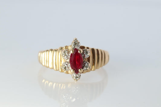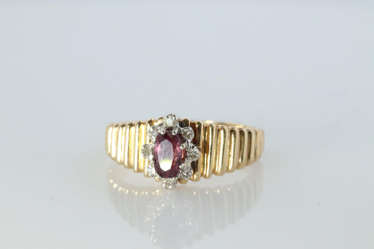 10k Ruby and Diamond HALO ring. 10k Yellow Gold Ribbed shank Ruby Halo ring.