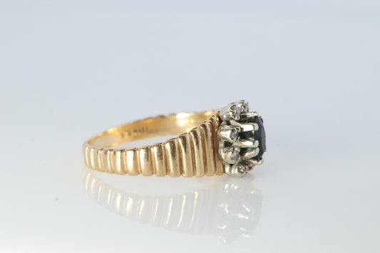 10k Sapphire and diamond Halo ring. 10k Blue sapphire and diamond ribbed band.