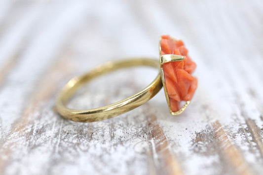 خاتم كابوشون وردي منحوت من المرجان عيار 14 قيراطًا. خاتم سوليتير من المرجان الخوخي المنحوت على شكل زهرة وردة عيار 14 قيراطًا.