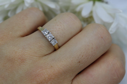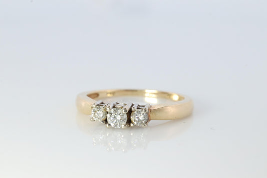 خاتم ثلاثي من الألماس عيار 14 قيراطًا. خاتم من 3 أحجار ألماس بوزن 0.58 قيراطًا. خاتم ثلاثي من الألماس.