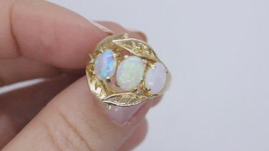 خاتم ثلاثي من الأوبال عيار 14 قيراطًا. خاتم مميز من الأوبال الثلاثي والكريستال وأوراق الشجر الدقيقة.