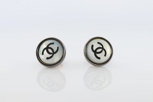 أقراط شانيل. أقراط دائرية من MOP CHANEL باللونين الأبيض والأسود. أقراط مرصعة. أزرار مرصعة.