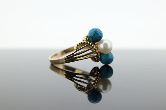 خاتم من مجموعة الفيروز واللؤلؤ عيار 10 قيراط. خاتم من مجموعة كرات من حبات الفيروز واللؤلؤ st(95)