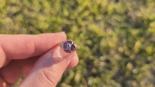خاتم ألكسندريت سوفييتي روسي بنفسجي/أزرق عيار 14 قيراطًا. ألكسندريت بيضاوي كبير وذهب وردي. ألكسندريت متغير اللون قديم