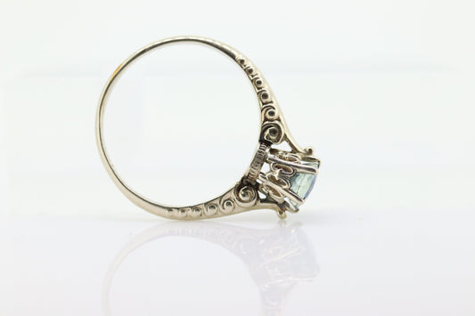 خاتم سوليتير بيضاوي كبير من الياقوت الأزرق عيار 14 قيراطًا. تصميمات آرت ديكو محفورة من الذهب الأبيض عيار 14 قيراطًا وكاتدرائية مرتفعة. st(63)
