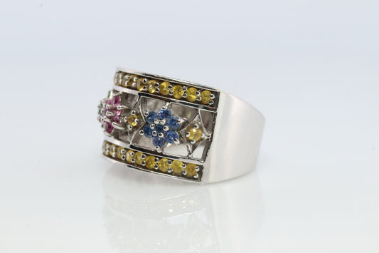 خاتم Le Vian Flower عريض من الذهب الأبيض عيار 14 قيراطًا مرصع بالياقوت الأزرق والزمرد من Levian Le Vian بنمط ديزي.