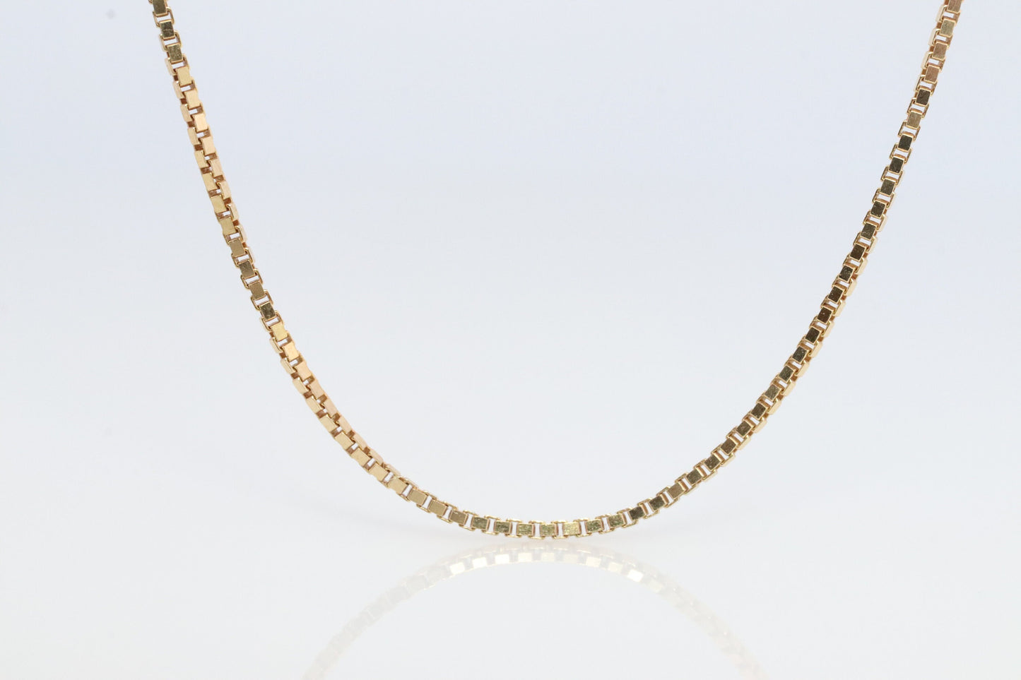 قلادة سلسلة صندوقية من الذهب عيار 14 قيراطًا. قلادة سلسلة صندوقية من الذهب عيار 14 قيراطًا. 20 بوصة ووزن 2.3 جرام وعرض 1 مم