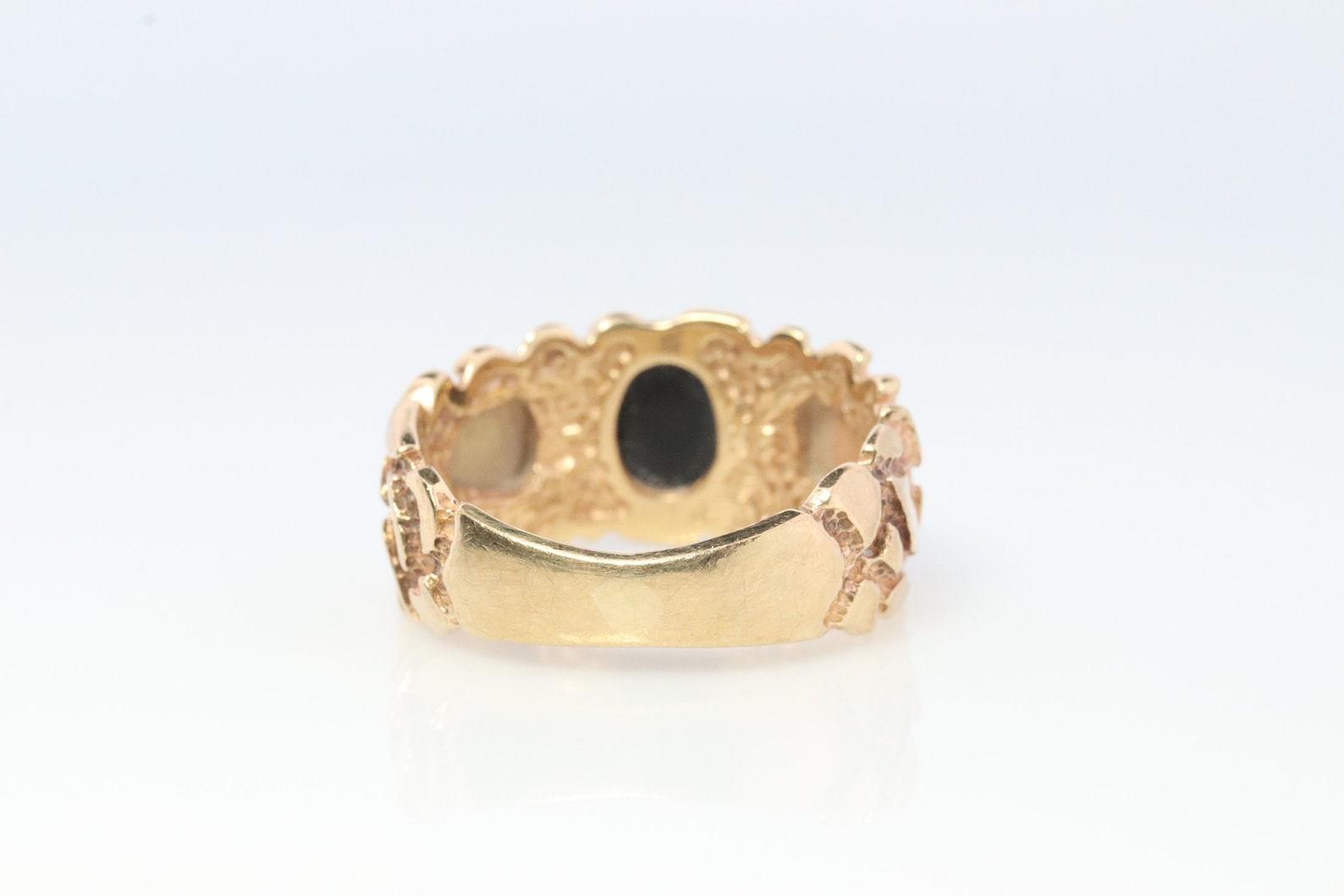 خاتم من الذهب الأسود مرصع بحجر العقيق النادر من كابوشون. ذهب متعدد الألوان عيار 10 قيراط.