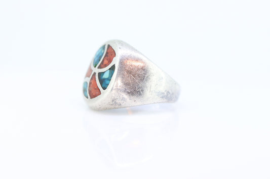 Heavy Zuni Sterling Silver Signet ring. MOP Turquoise Carnelian Inlay Design. Sz 13