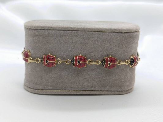 LADYBUG bracelet. 14k Yellow Gold Lady Bug Enamel Station Bracelet. 14k Yellow Gold Beetle bracelet. st(212/75)