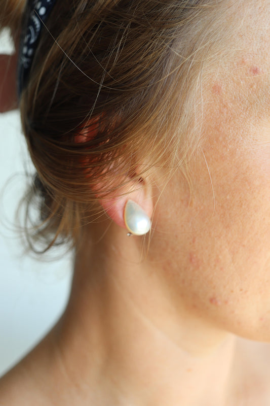 Large Mabe Pearl Earrings. 14k White Gold Clip On Un pierced Drop Pear MABE