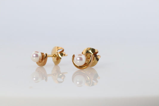 Mikimoto Moon Earrings. 18k Yellow Gold Mikimoto Pearl Dainty Stud Earrings.