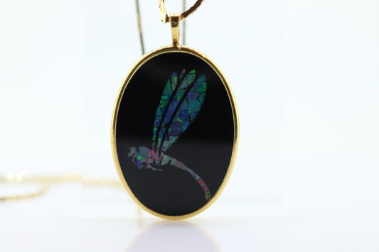 Opal Mosaic Onyx Pendant. 14k Yellow Gold Medallion. Dragonfly Dragon fly cluster opal inlay onyx charm necklace. (st117/87)