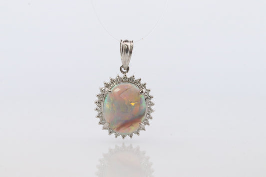 Opal Diamond Pendant. PT900 Platinum Opal Diamond Halo Pendant Necklace. Genuine Australian Opal Cabochon.