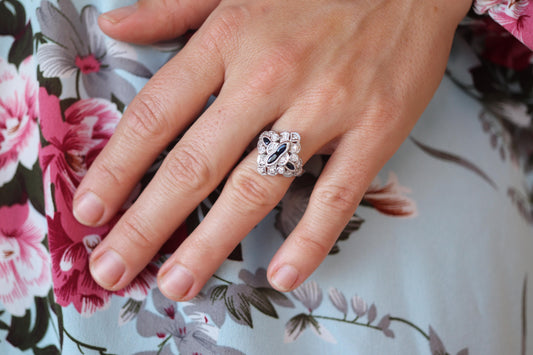 Shield Diamond Sapphire ring. 18k diamond and sapphire shield ring. 18k Art Deco diamond filigree signet ring. st(140)