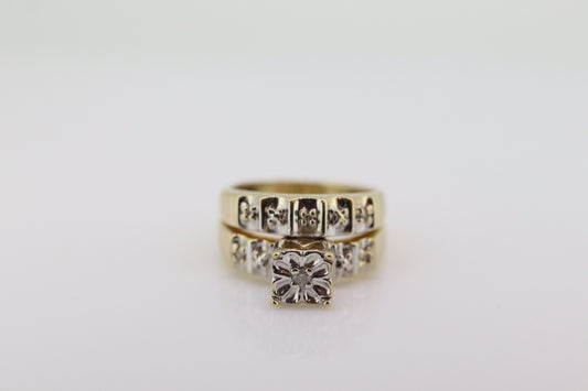 Vintage 10k Yellow Gold Diamond Wedding Ring set. Small diamond flower Bridal Set ring. st(100)