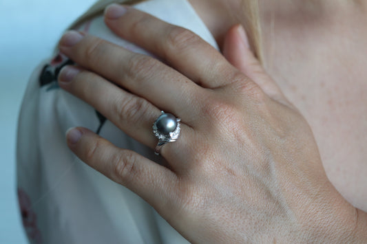 Vintage Tahitian Pearl and Diamond Solitaire ring. Platinum PT900 Large BLACK Tahitian Pearl Halo Ring.