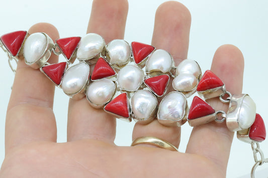 Vintage Pearl Coral Bracelet. RED Coral and Blister Pearl Bezel set 925 Sterling Silver Bracelet. Mabe pearl. St(25)