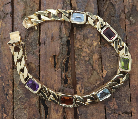 14k Heavy Multi-Color Gem Cuban Chain Bracelet. 23.6g 14k Cuban Chain Bezel Chain Bracelet. Citrine Amethyst Garnet Peridot st (622/15)