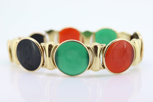 14k Intaglio Roman soldier, Centurion Bracelet. 14k gold Heavy Carved Warrior Onyx Carnelian Chalcedony Panel Bracelet. (st461)