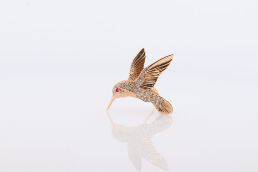 14k Hummingbird with Diamonds Ruby. Ballou & Co Bird Brooch Diamond encrusted with ruby eyes. BAB. st(237)