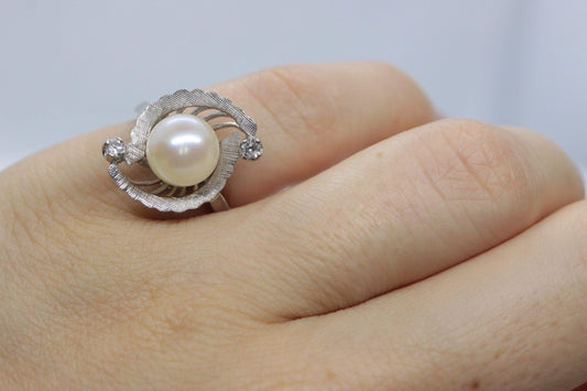 14k Pearl (8mm) and Diamond Solitaire ring. 14k White gold Filigree ring Akoya