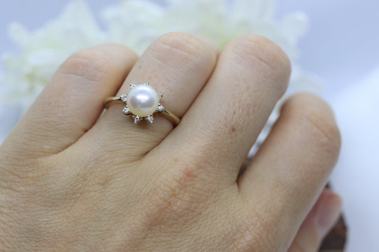 14k Pearl and Diamond Halo ring. 14k White gold Solitaire Halo ring with AKOYA
