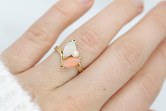14k Pink Coral Opal and Pearl Cabochon cluster ring. Navette Peach coral band
