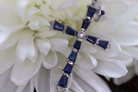 14k Sapphire and Diamond Cross Pendant. Crucifix Christian set baguette sapphires. st(115/11)