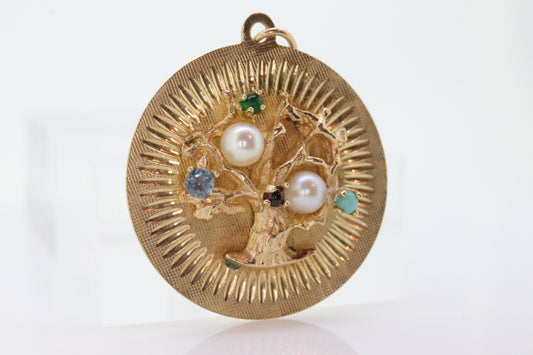 14k Tree of Life Round Medallion Pendant. Turquoise Pearls Emerald Ruby Aquamarine fruits. stock(109/25)