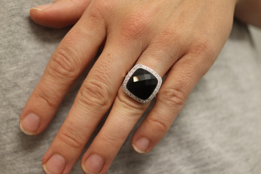 18k Gold ONYX Diamond Halo ring. Checkered French Cut Onyx Dome Halo Ring
