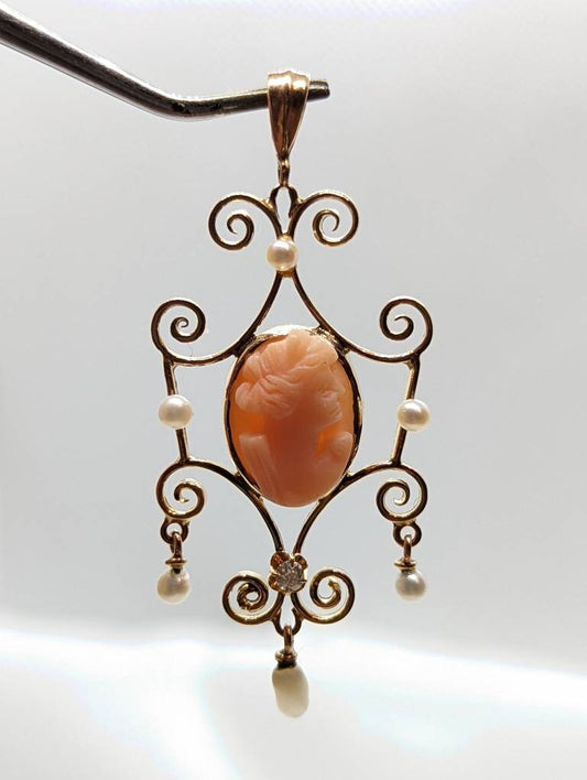 Antique Diamond Coral cameo pendant lavaliere. 10k Gold diamond buttercup Carved coral cameo pearl pendant for necklace.