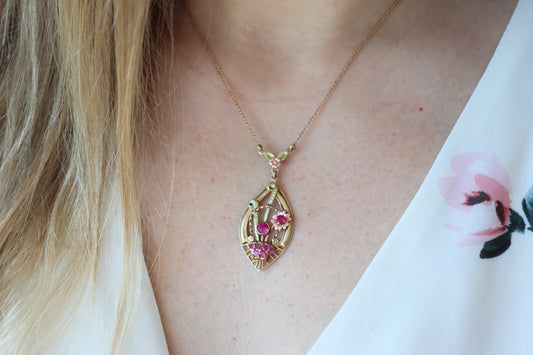 Antique Victorian Lavaliere Pendant Necklace. 10k Rose and Yellow Gold with Rubi