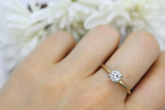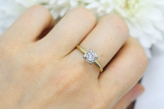 Art Deco Diamond Solitaire Square setting Ring. 14k Gold European Cut diamond