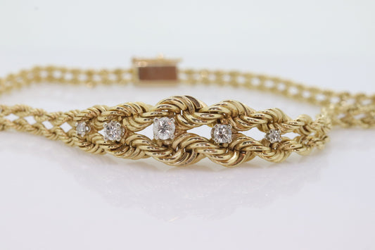 Diamond Double Row Rope 14k Bracelet. 14k rope bracelet. Graduating Rope Bracelet with Diamonds. Vintage Gold Bracelet st(280)
