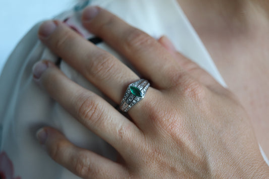 Emerald shield ring. Platinum Shield Ring Emerald Cabochon and Diamond wide band