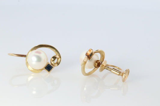 Mikimoto Earrings. 14k Gold Mikimoto Pearl and Sapphire Clip Ons. Unpierced