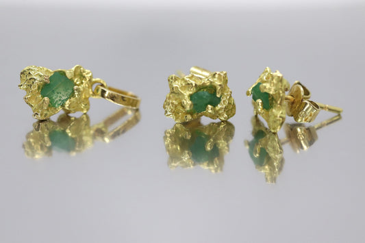 18k Rough Emerald Stud earrings and matching Pendant. 18k Gold Nugget design Jewelry set