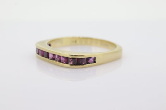 14k Eternity Half Ruby Ring. Euro Shank flat bottom. A 14k gold ring with Princess cut Ruby channel half calibre anniversary band. st(95)
