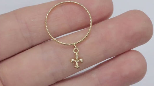 18k Fleur De LIS Charm dangle ring. Feur De Lis French Flower charm rope band.