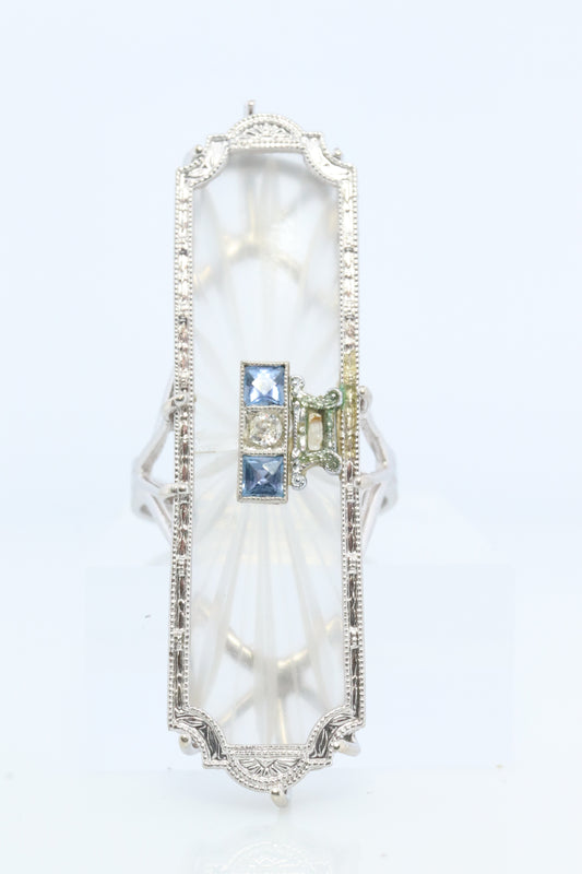 14k Camphor Glass Diamond Princess Sapphire ring. Art Deco Filigree Frosted Rock Crystal Ring with a diamond and Sapphire. st(322)