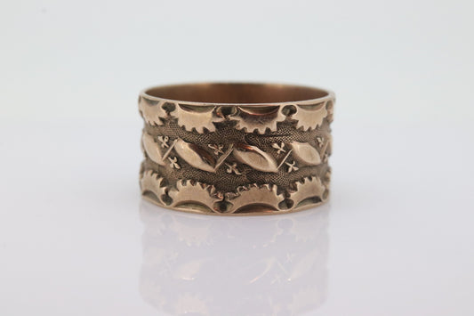 10k Antique Wide Victorian Cigar band. 10k Rose Gold Antique Embossed Flower Leaf design. 10mm sz7.5 st(132)