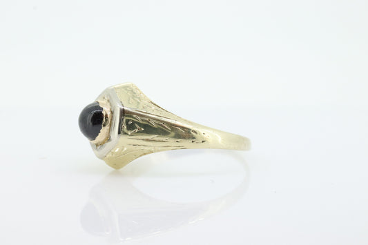 14k Red Tourmaline Antique Ring. Bezel set Round Cabochon Tourmaline solitaire engraved ring. st(104)
