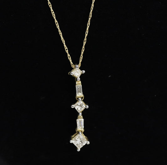 10-karätiger 3-Diamant-Anhänger „Vergangenheit, Gegenwart, Zukunft“, Reise. 0,60 ctw Princess- und Baguette-Diamanten. Seilhalskette aus 10-karätigem Gelbgold. (88)