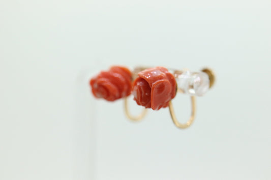 Korallenohrringe. 14-karätige geschnitzte Korallen-Rosenblüten-Ohrringe. Nicht durchbohrte Schraubklemmen zum Anklipsen. Spannungsohrringe. st(75)