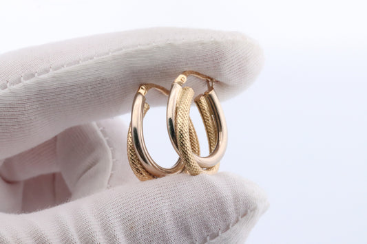 Hohle Creolen aus 14-karätigem Gold. Ineinander verschlungene Ohrringe mit strukturierter Schleife. Hängende Multi-Creolen.