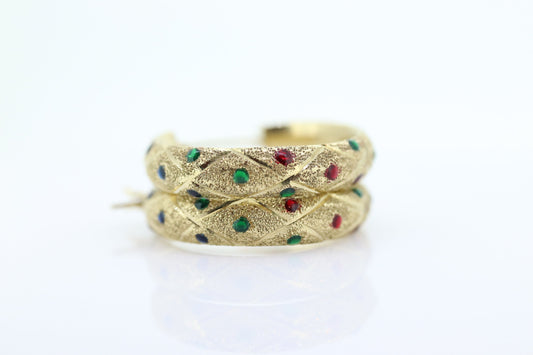 Creolen. 10 Karat Gelbgold. Strukturierter Emaille-Punkt. Weihnachtsfarben. Poka-Dot-Ohrringe. M(55/11)