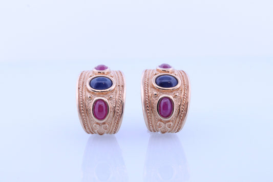 Byzantinische etruskische Ohrringe aus 14 Karat Rubin-Saphir-Cabochon. 14-karätiges Gold etruskisches Revival-Rubin-Saphir-Dangle-Lünetten-Set mit Omega-Rückseiten st(352)
