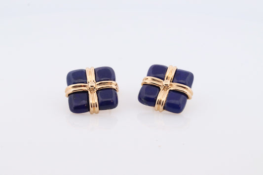 14-karätige Lapislazuli-Ohrringe. GESCHENK, quadratisch verpackt, präsentiert blaue Lapislazuli-Ohrstecker aus Gold. Geschnitzte Lapis-Ohrstecker. st(124)