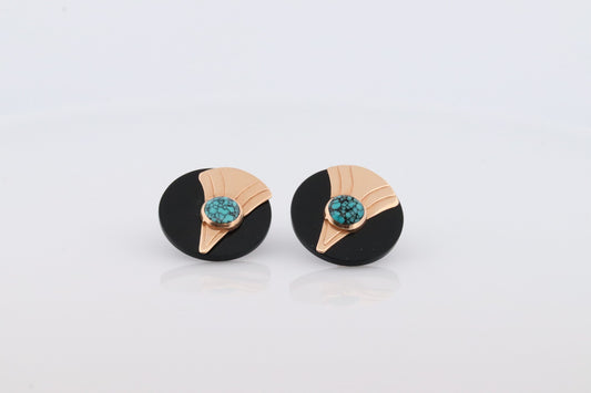 Runde Ohrringe aus geschnitztem Onyx aus 14 Karat. Ohrringe aus 14-karätigem Onyx und Türkis mit Lünette. st(47)